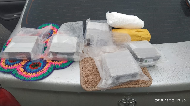 В ходе осмотра автомобиля за спинкой пассажирского заднего сиденья были обнаружены пять брикетов серого цвета, упакованные в полимерные прозрачные пакеты и предмет прямоугольной формы с порошкообразным веществом.