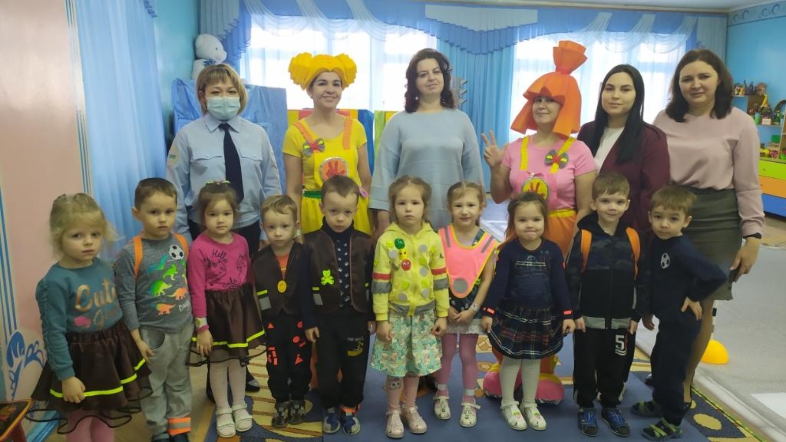 После того, как дети прочитали стихи по безопасности дорожного движения, сотрудники ГИБДД дополнили выступление сказочных персонажей информацией о том, как световозвращающие элементы помогают пешеходам стать более заметными для водителей.