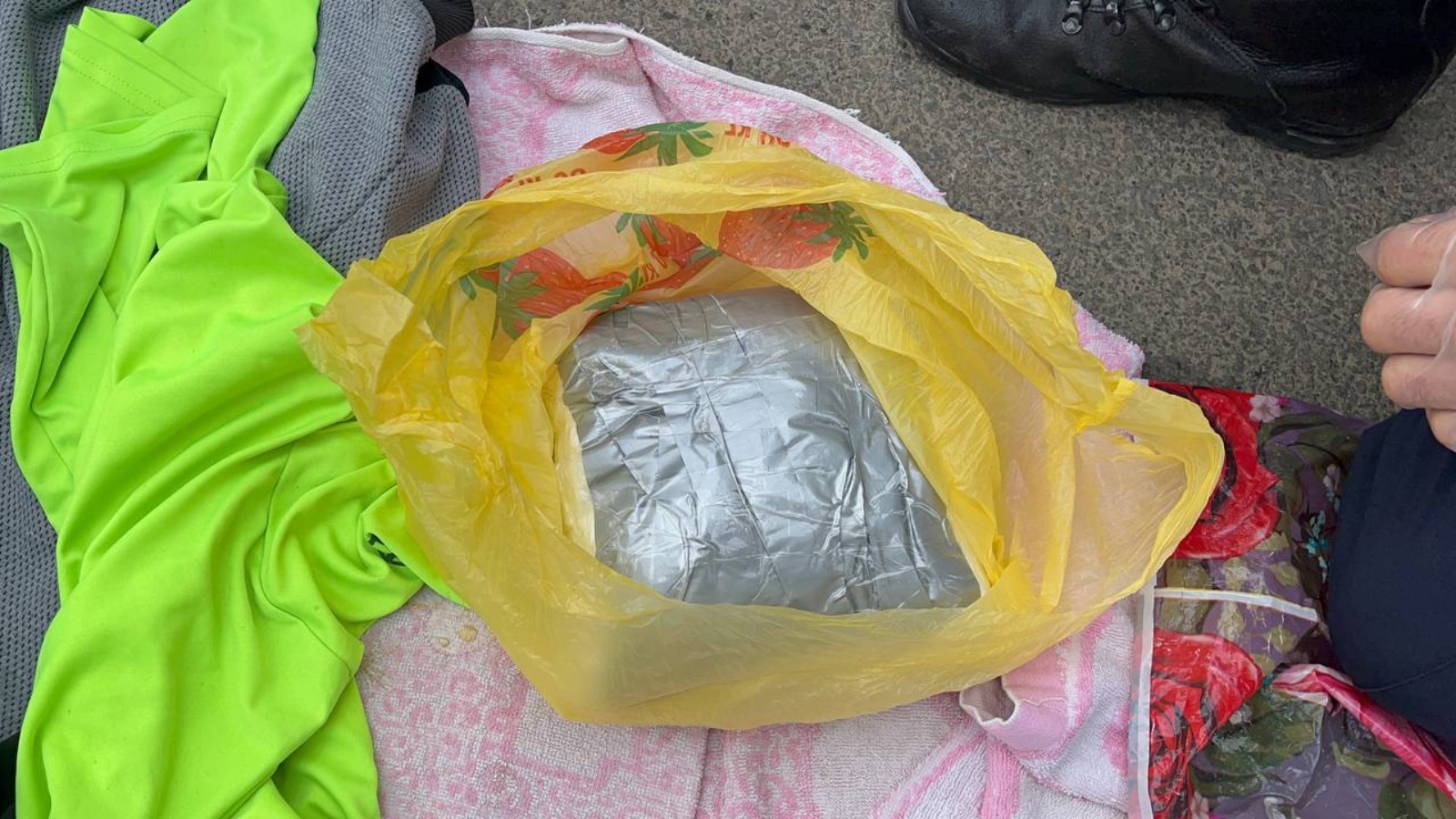 Во время досмотра автомобиля на заднем сиденье был обнаружен полимерный пакет, внутри которого находилось два свертка, обмотанные скотчем, с порошкообразным веществом внутри.